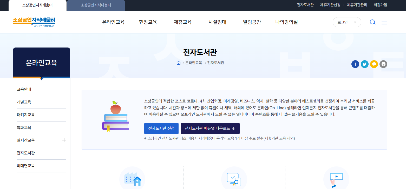 - 온라인 교육 이수하기 : 소상공인이 아니더라도 누구나 간단한 온라인 교육을 이수하면 무료로 전자책 및 오디오북을 이용할 수 있습니다. 교육은 10분 정도면 완료할 수 있습니다.